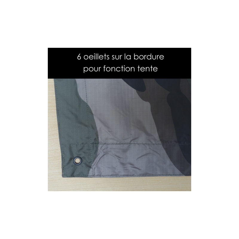 - Transformable en tente (6 oeillets sur la bordure) ou en bâche