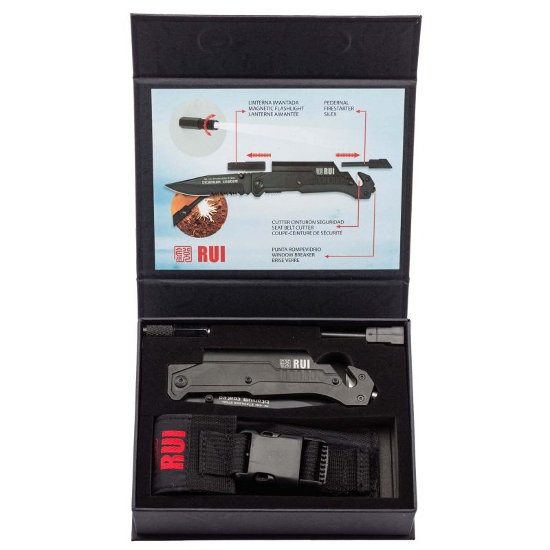 Son manche multifonction vous offre une gamme d'outils complémentaires : coupe-ceinture, lampe LED, allume-feu et une pointe brise-vitre pour les situations critiques.