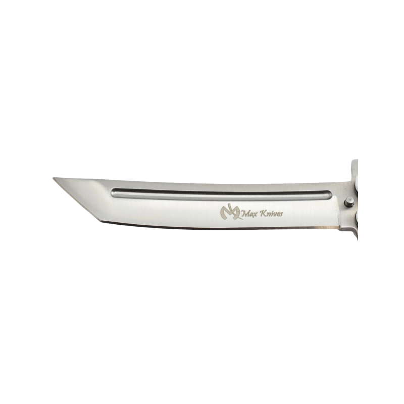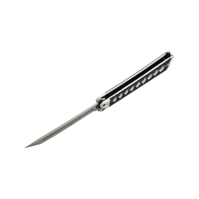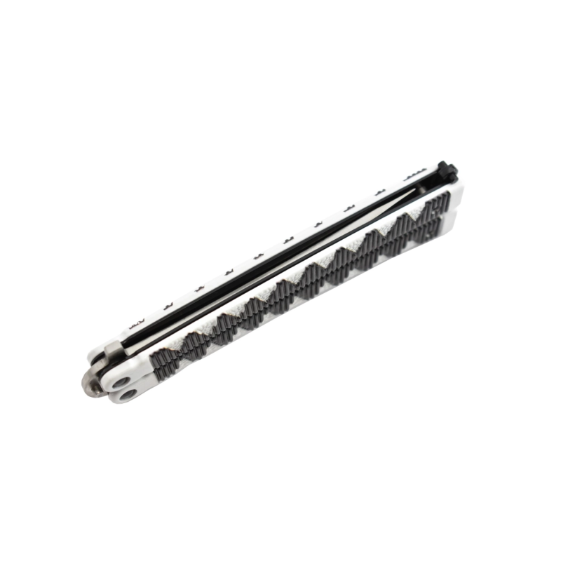 Le Couteau Papillon P46S de Max Knives, avec son manche en aluminium blanc et noir inspiré du tressage japonais, allie élégance et robustesse.