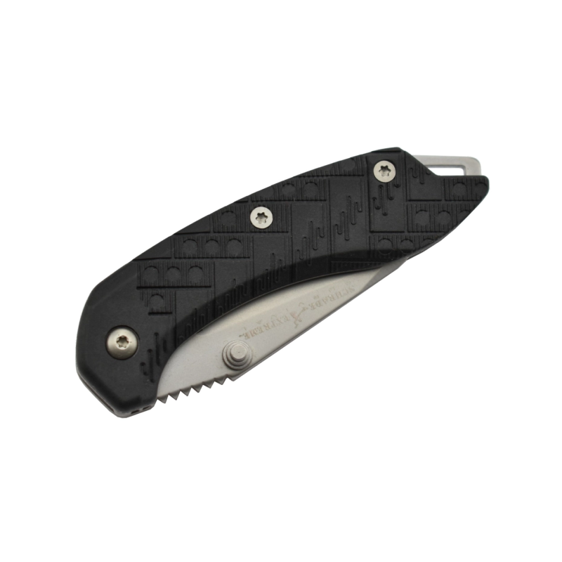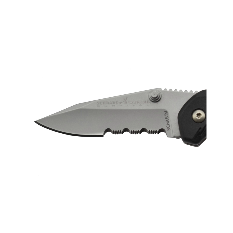 Le couteau SCHRADE SCHAS1M présente une lame avec serrations sur la moitié du tranchant, pour différents types de coupe.