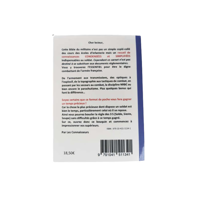 Découvrez "Le Carnet du Combattant" par LESCONNAISSEURS, la dernière version actualisée et optimisée, essentielle pour tout soldat professionnel désireux d'exceller dans son métier. Ce guide compact, mais exhaustif, est également une lecture incontournable pour ceux aspirant à s'engager dans l'armée ou simplement passionnés par le domaine militaire.