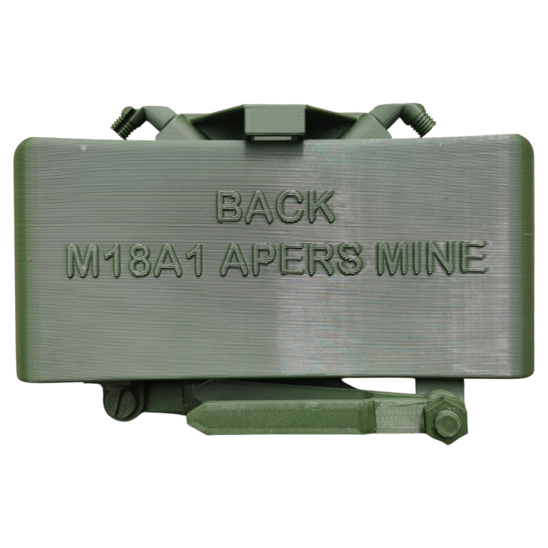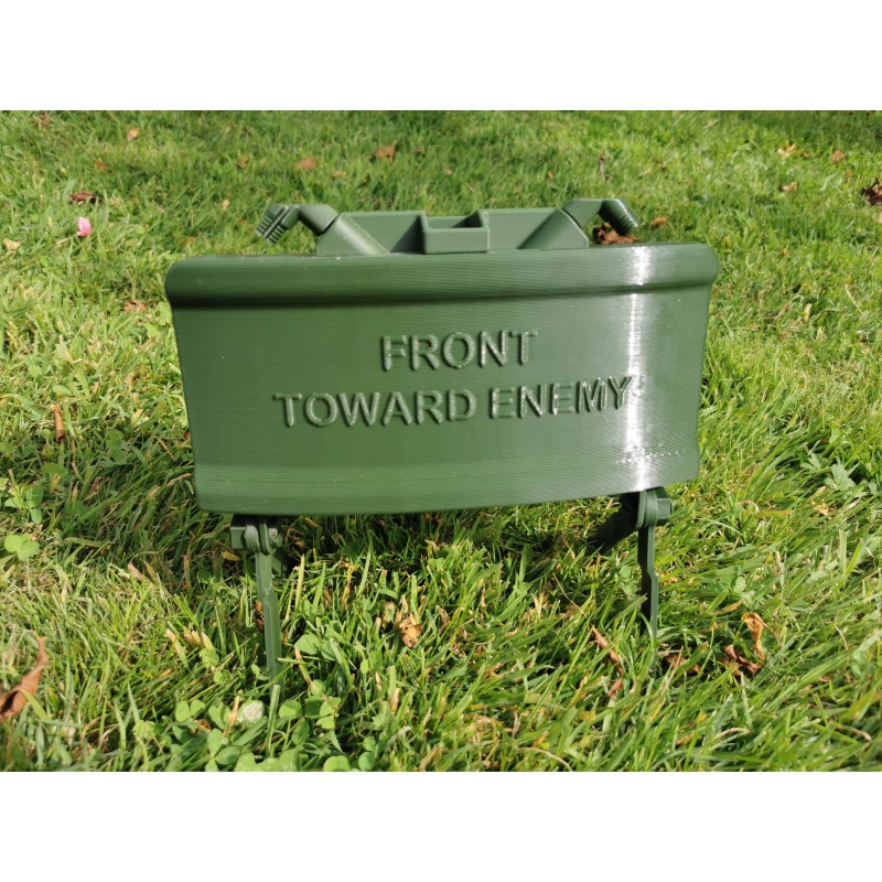 Reproduction fidèle de la mine Claymore M18A1 en PLA, avec pied articulé, totalement inerte, idéale pour l'airsoft, la déco ou la collection.