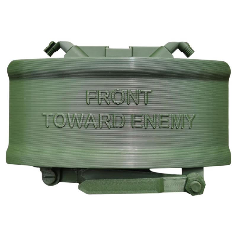 Reproduction fidèle de la célèbre mine antipersonnel Claymore M18A1 utilisée par l'armée américaine. Conçue en impression 3D PLA, cette réplique est totalement inerte et sans danger. Elle inclut un pied articulé pour la poser au sol ou l’exposer sur un support.