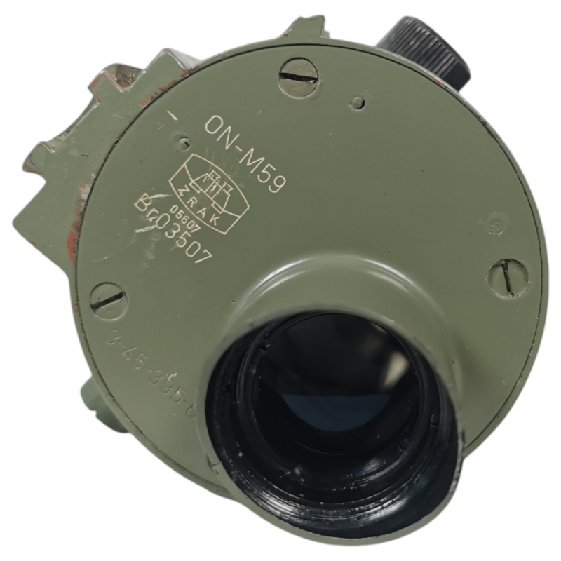Le monoculaire militaire ON-M59, utilisé par l'armée Yougoslave, possède un ajustement de la verticalité de la visée ainsi qu'une hausse et un guidon, en cas de défaillance de la monoculaire. De couleur verte authentique, il est accompagné de son étui en cuir original de très belle facture.