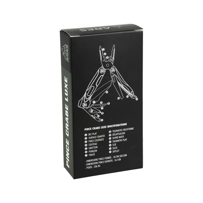 La pince multifonction CRABE LUXE, de la marque ARES, est spécialement conçue pour les professionnels, les adeptes d'activités outdoor et les amateurs de bricolage. Avec ses 14 fonctionnalités, la pince CRABE LUXE, compacte et ergonomique, est parfaite pour le camping, bivouac ou les interventions sur le terrain.
