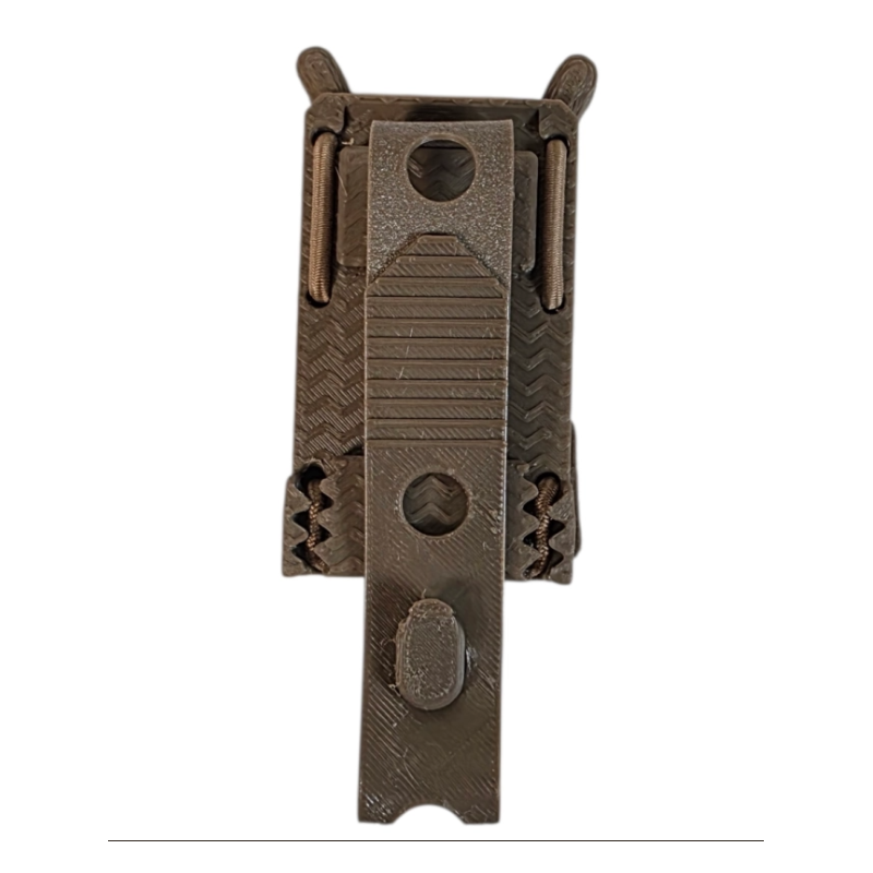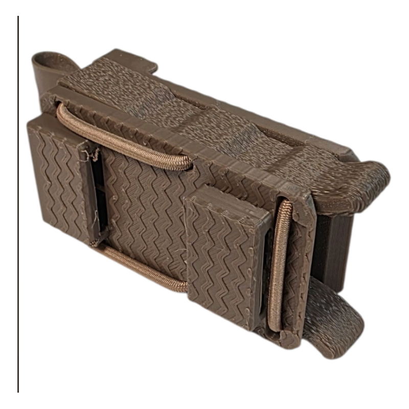 La forme du corps épouse le chargeur pour créer une rétention mécanique stable. Vous ne dépendez pas d’un rabat ni d’une cordelette qui pend. La prise reste nette et la sortie du chargeur plus fluide. La surface externe à motif chevron améliore en plus le grip à la manipulation.