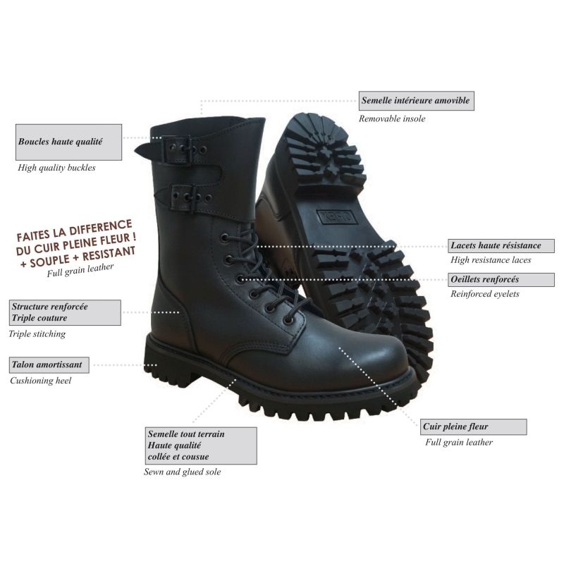 Les Rangers INVADER sont des chaussures anglaises coquées, en cuir de vache et avec une hauteur de tige de 25 cm pour un maintien optimal de la cheville.