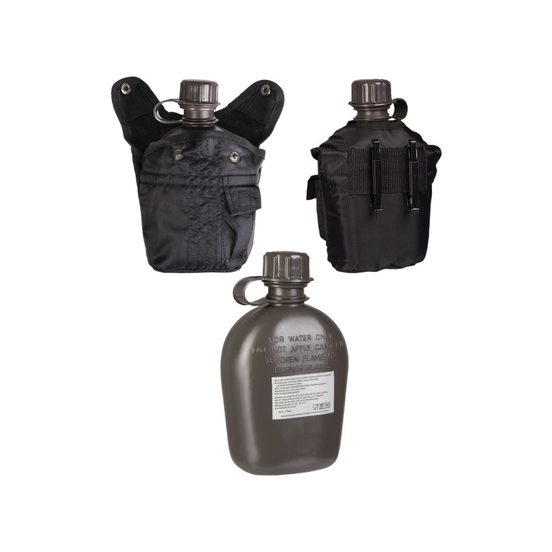 Gourde US 1L en PVC avec housse noire Mil-Tec, inspirée du modèle militaire américain. Robuste, légère, fixable à la ceinture, idéale pour la randonnée, le bushcraft ou le bivouac.
