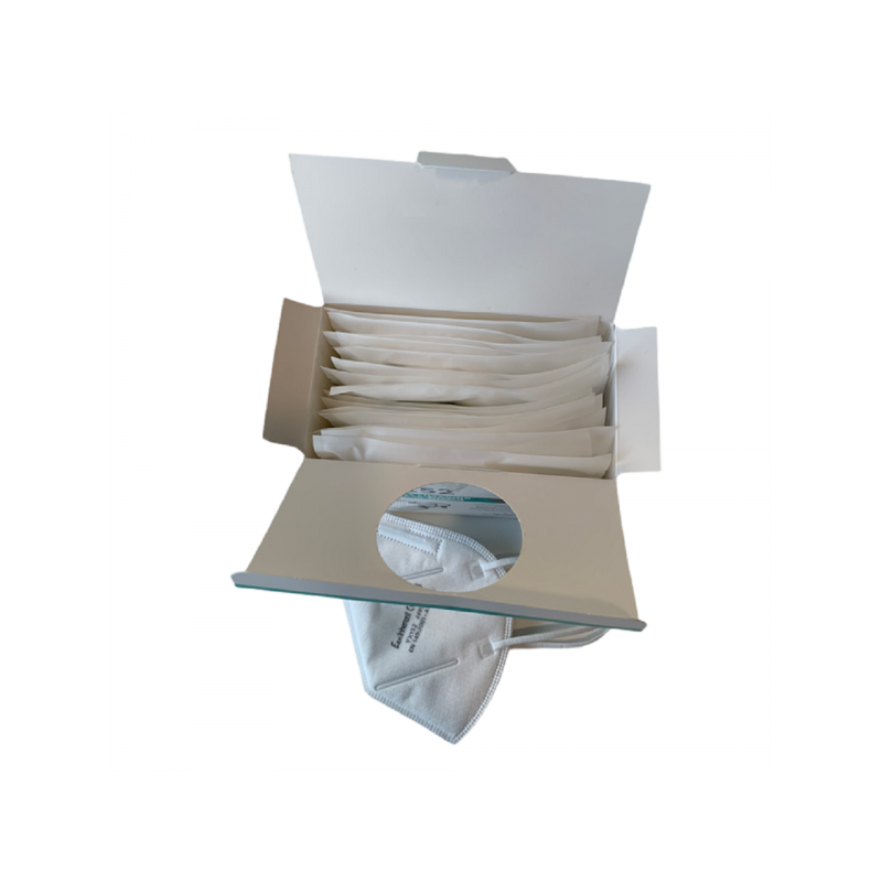 - Demi-masque filtrant blanc non réutilisable non stérile contre les particules de type FFP2 avec bride blanche.