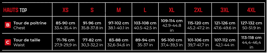 - Tailles : code NATO (ex. 80-88-104) ; hauteurs Short/Regular/Long/X-Long